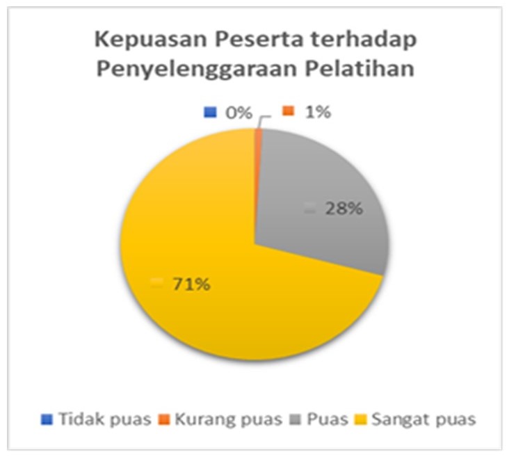 Kepuasan peserta terhadap keseluruhan komponen penyelenggaraan pelatihan menunjukkan bahwa 71% menyatakan sangat puas, dan 28% menyatakan puas, sebagaimana grafik.