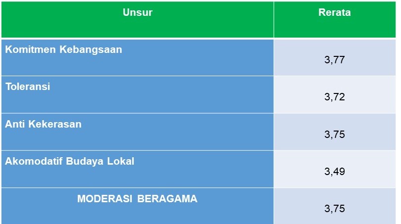Pelatihan penguatan moderasi beragama tentang sikap moderasi beragama ditinjau dari jenjang kepegawaian, jenjang pendidikan dan jenis pekerjaannya, adalah sebagai berikut: Rerata skor sikap moderasi beragama dari ASN penggerak moderasi beragama setiap jenjang, usia, maupun pendidikan ASN menunjukkan hasil sikap yang relatif sama, dan rerata keseluruhan skor sikap moderasi beragama ASN adalah 3,75. Hasil pada unsur dari sikap moderasi beragama menunjukkan bahwa komitmen kebangsaan, sikap anti kekerasan dan sikap toleransi para penggerak moderasi beragama cukup tinggi, sedangkan sikap akomodasi terhadap budaya lokal cukup, sebagaimana tabel berikut.