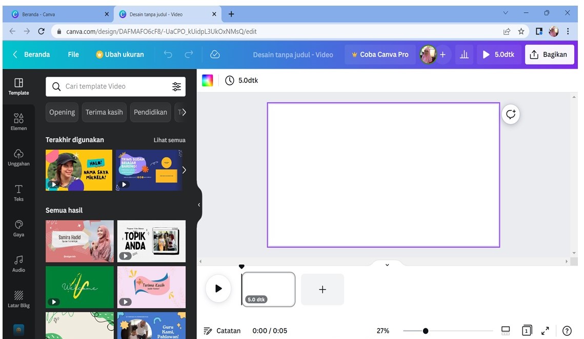 Anda bisa mengklik make a design/ buat design untuk memulai. Anda bisa memilih fasilitas yang sudah disediakan canva. Untuk membuat video pembelajaran maka dipilih video. Disebelah kiri terdapat beranda untuk tampilan awal. Templete berisi berbagai tampilan yang bisa kita manfaatkan. Fasilitas gratis ditandai dengan tidak adanya tanda mahkota, bila ada tanda mahkota maka fasilitas tersebut berbayar. Jika Anda menggunakan templete yang memiliki mahkota, ketika mendesai Anda masih bisa memakainya tapi nanti setelah di akhir atau ketika mau mendownload atau mengshare hasil video Anda maka Anda akan diminta pembayarannya. Berhati hatilah dalam memanfaatkan versi gratis dari canva. Project atau proyek adalah tempat tersimpannya desain yang Anda miliki selama Anda menggunakan akun dengan email yang Anda pakai.