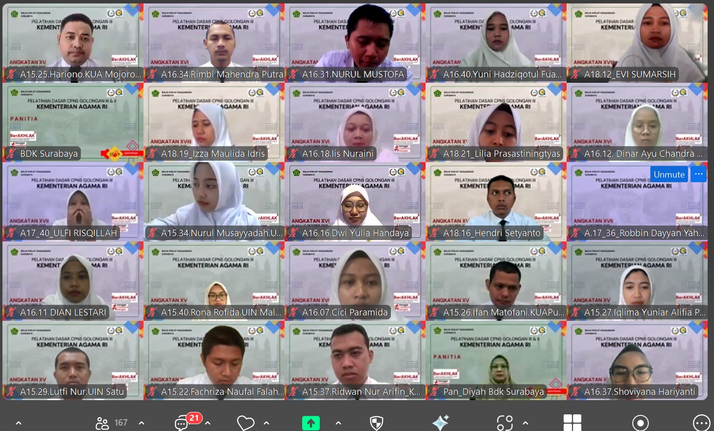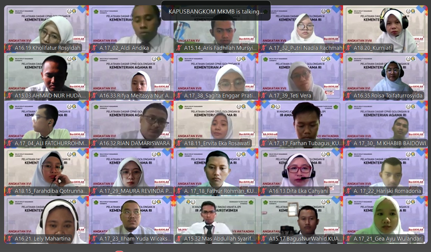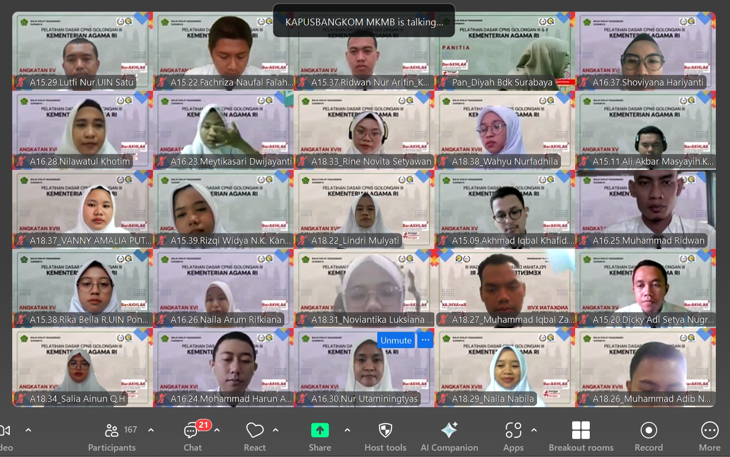 Surabaya, 20 Agustus 2025 — “Banggalah menjadi ASN Kementerian Agama, mulailah dengan niat baik, dan teguhkan profesionalisme,” tegas Kapusbangkom Manajemen, Kepemimpinan, dan Moderasi Beragama Dr. Syafi’i, M.Ag. saat menyampaikan materi Manajemen Kepemimpinan dan Moderasi Beragama dalam Latsar CPNS Kemenag BDK Surabaya, Selasa (20/8). Pesan ini disampaikan di hadapan 160 peserta dari empat angkatan melalui Zoom Meeting.
