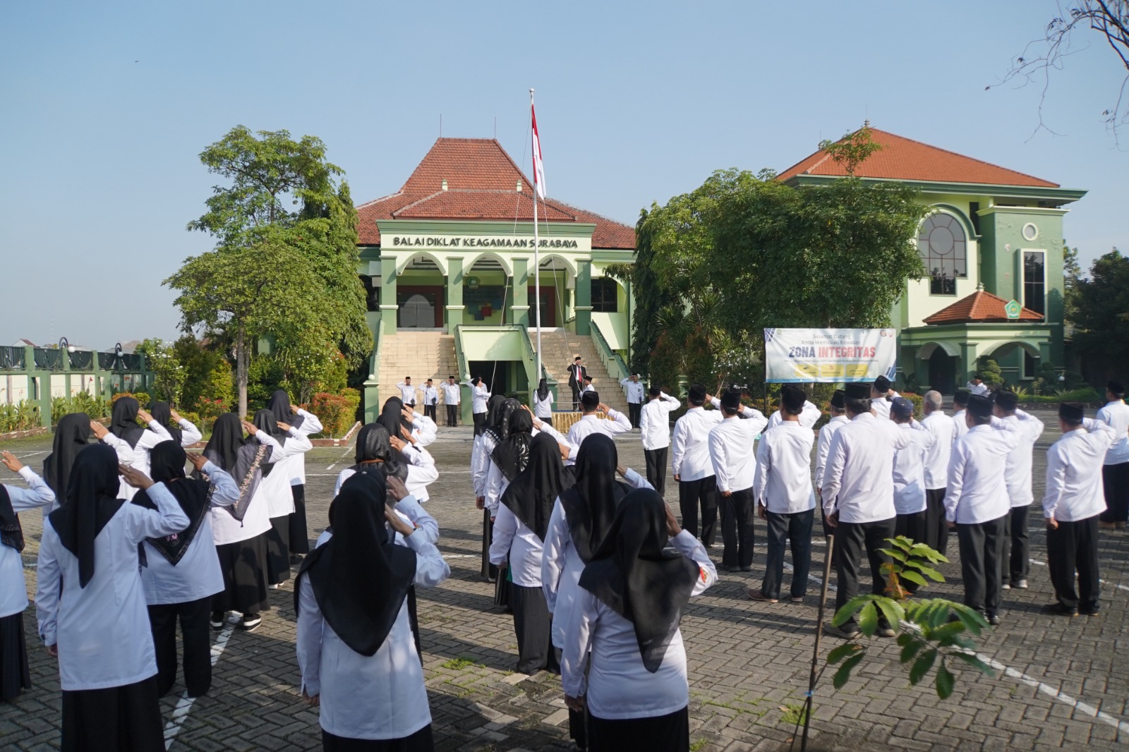 Surabaya (2/6/2025) – Balai Diklat Keagamaan (BDK) Surabaya melaksanakan upacara peringatan Hari Lahir Pancasila Tahun 2025 pada Senin, 2 Juni 2025 di halaman kantor BDK Surabaya. Upacara diikuti oleh seluruh pejabat struktural, widyaiswara, dan pegawai BDK Surabaya. Bertindak sebagai Inspektur Upacara adalah Kepala BDK Surabaya, Dr. H. Japar, M.Pd.