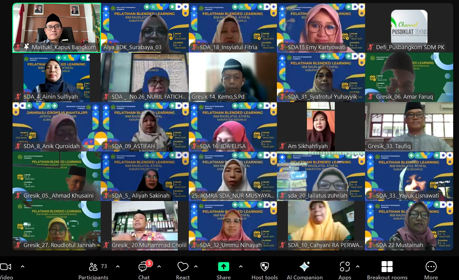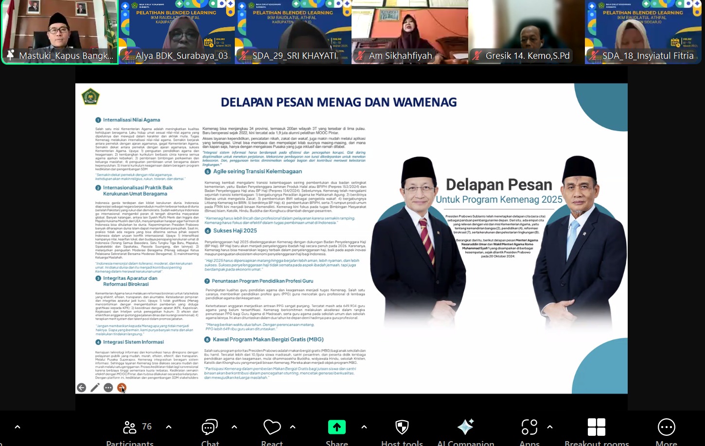 Surabaya, 12 Maret 2025 – Dalam upaya memperkuat pembangunan bidang agama di Indonesia, Kepala Pusat Pengembangan dan Pelatihan Pendidikan dan Keagamaan Badan Moderasi Beragama dan Pengembangan Sumber Daya Manusia Republik Indonesia, Dr. H. Mastuki, M.Ag., menggelar pemaparan inspiratif bertajuk *”Pembangunan Bidang Agama di Indonesia”*. Sesi daring yang berlangsung melalui kanal Zoom Meeting ini diikuti oleh 70 peserta dari Pelatihan Implementasi Kurikulum Merdeka (IKM) Raudhatul Athfal Kabupaten Sidoarjo dan Pelatihan IKM Pembelajaran Berdiferensiasi Kabupaten Gresik.