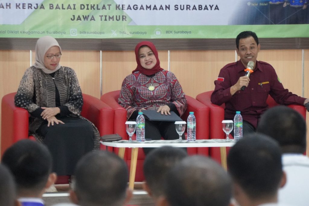 Surabaya – Penguatan karakter dan profesionalisme aparatur sipil negara kembali menjadi sorotan dalam Pelatihan Dasar (Latsar) CPNS Kemenag Golongan III yang berjumlah 80 peserta di Balai Diklat Keagamaan Surabaya pada Rabu (12/11/25). Dalam sesi materi yang disampaikan, Kepala Pusbangkom Manajemen Kepemimpinan dan Moderasi Beragama, Musyarrafah Amin, menegaskan pentingnya ASN memahami esensi tugas dan fungsinya.