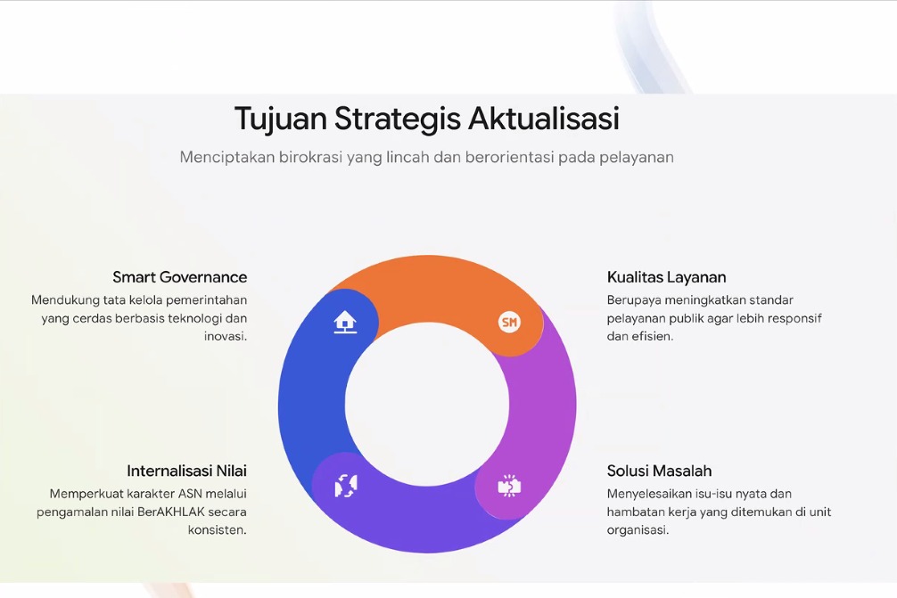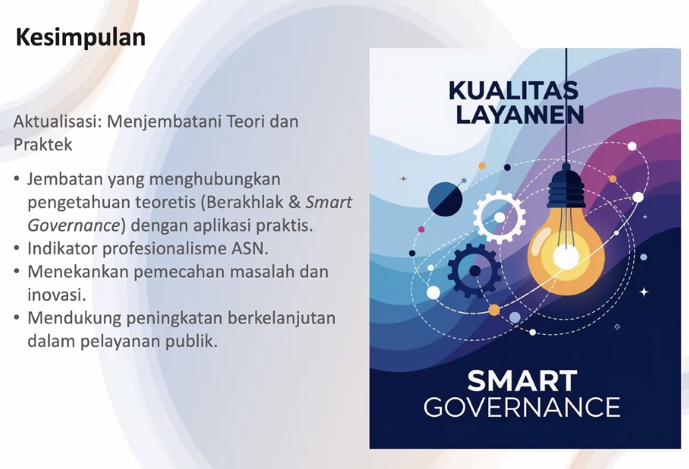 Pertemuan daring tersebut membahas secara komprehensif komponen utama dalam penyusunan Rancangan Aktualisasi, mulai dari identifikasi isu strategis di unit kerja, analisis akar penyebab menggunakan metode yang tepat, perumusan solusi inovatif, hingga penyusunan rencana kegiatan, output, dan indikator keberhasilan yang terukur. Aktualisasi ditegaskan sebagai jembatan antara teori dan praktik, sekaligus wujud implementasi nilai BerAKHLAK dan prinsip Smart Governance dalam tugas ASN.