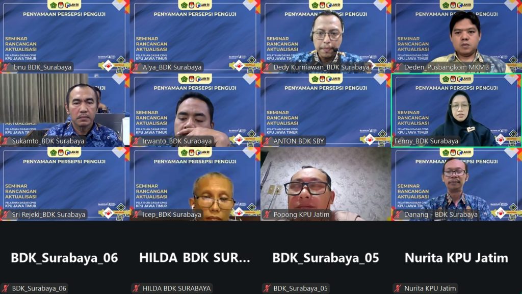 Surabaya (26/2/26)— Menjelang pelaksanaan Seminar Rancangan Aktualisasi (RA) Latsar CPNS KPU Jawa Timur, Balai Diklat Keagamaan Surabaya menggelar zoom meeting penyamaan persepsi bagi seluruh panitia, penguji dan coach. Kegiatan ini dilaksanakan sebagai langkah strategis untuk memastikan keseragaman pemahaman dalam proses pelaksanaan dan penilaian seminar RA.