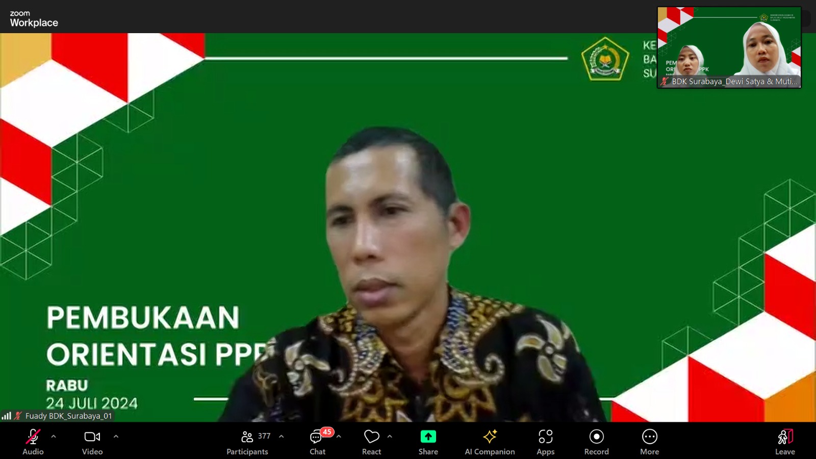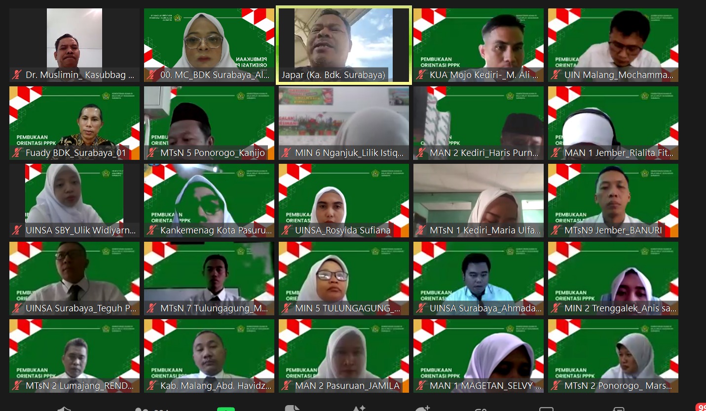 Dalam upaya meningkatkan kualitas pelayanan dan profesionalisme, Kepala BDK Surabaya, Dr. H. Japar, M.Pd., memaparkan lima nilai budaya kerja yang harus diterapkan oleh Aparatur Sipil Negara (ASN) di Kementerian Agama (Kemenag). Hal ini disampaikan dalam Pembukaan dan Sosialisasi MOOC Orientasi PPPK 2024, yang berlangsung melalui Zoom pada Rabu, (24/7/24).