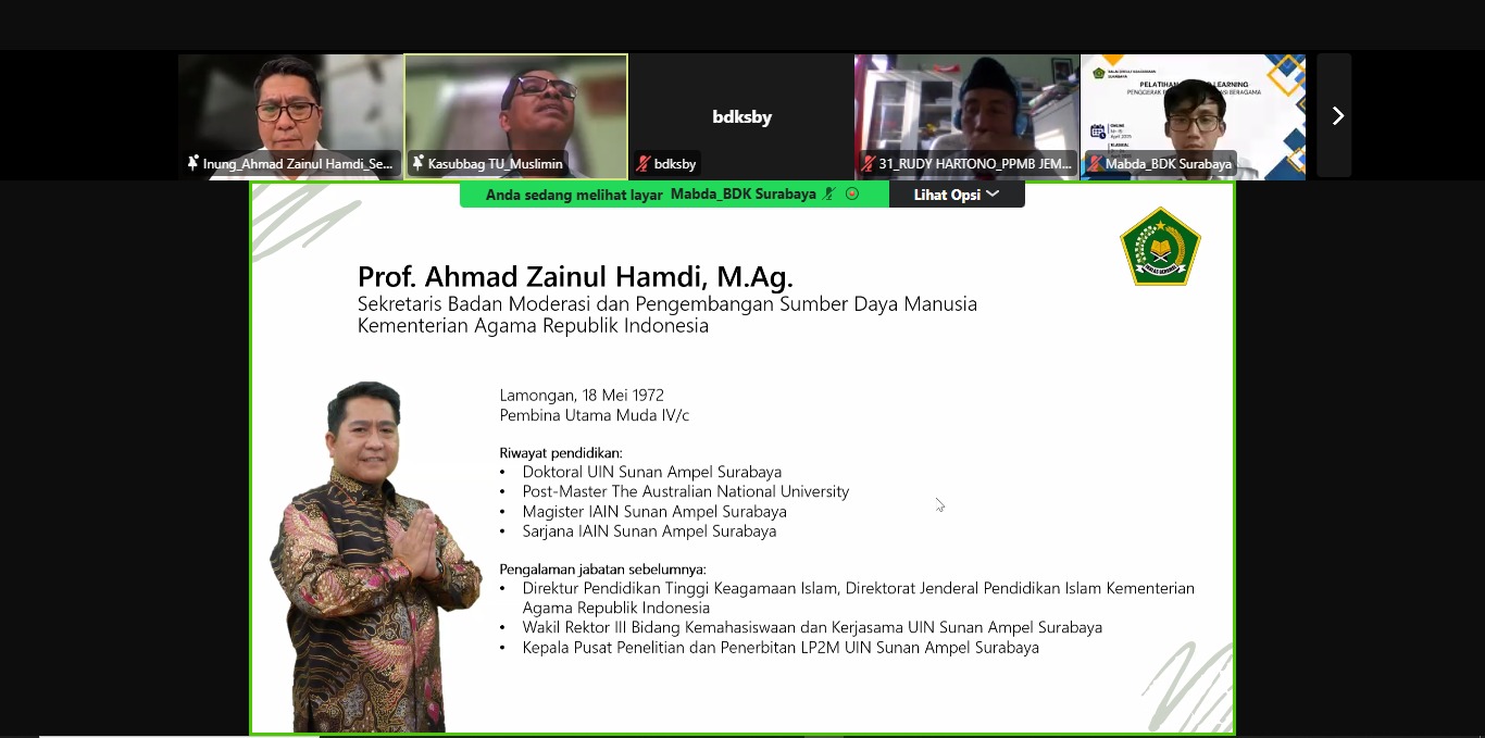 Surabaya, 15 April 2025 – Dalam upaya memperkuat pemahaman tentang moderasi beragama di Indonesia, Sekretaris Badan Moderasi Beragama dan Pengembangan Sumber Daya Manusia (SDM) Kementerian Agama, Prof. Ahmad Zainul Hamdi, M.Ag. yang akrab disapa Prof. Inung, menyampaikan materi Sketsa Kehidupan Beragama di Indonesia melalui platform Zoom Meeting. Acara ini diikuti oleh seluruh peserta Pelatihan di Wilayah Kerja Gelombang 3 dan 4 dari berbagai wilayah di Jawa Timur.