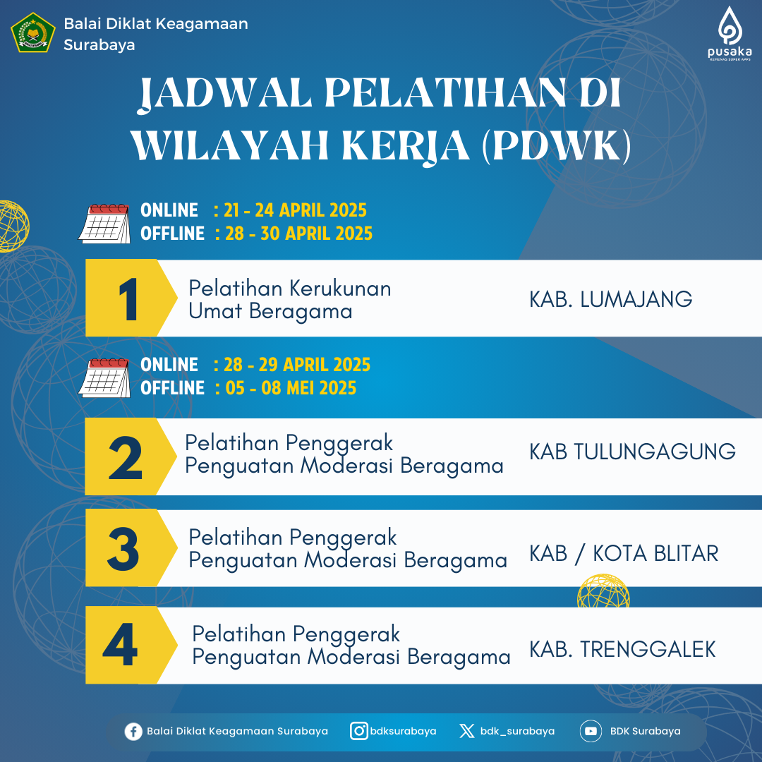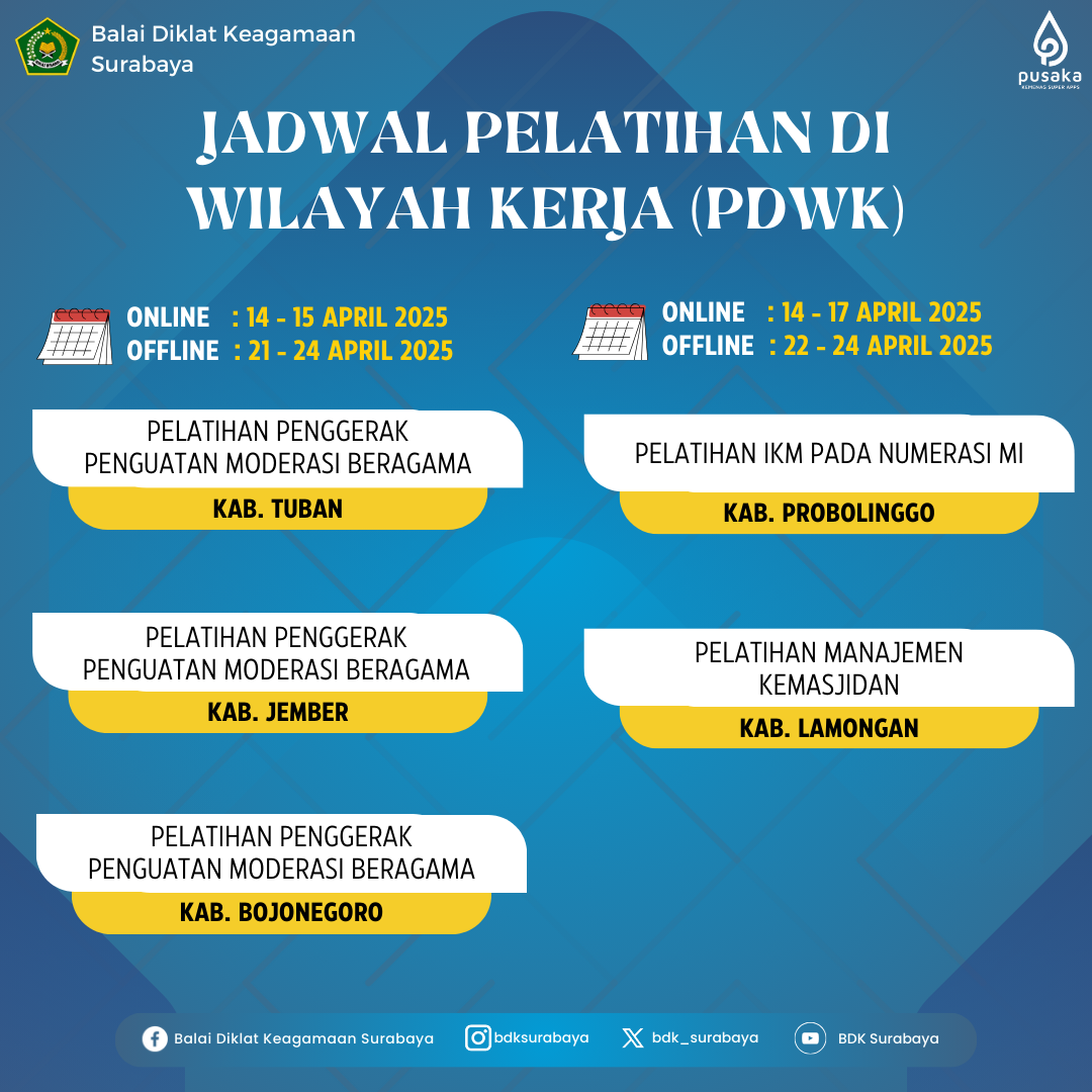 BDK Surabaya kembali mengadakan Program Diklat Widyaiswara (PDWK) untuk periode April 2025. Pelatihan ini akan dilakukan dengan sistem blended learning, yang mencakup sesi online dan offline, memungkinkan peserta untuk memilih metode yang paling sesuai dengan kebutuhan mereka. Berikut adalah jadwal lengkap pelatihan PDWK BDK Surabaya pada bulan April 2025: