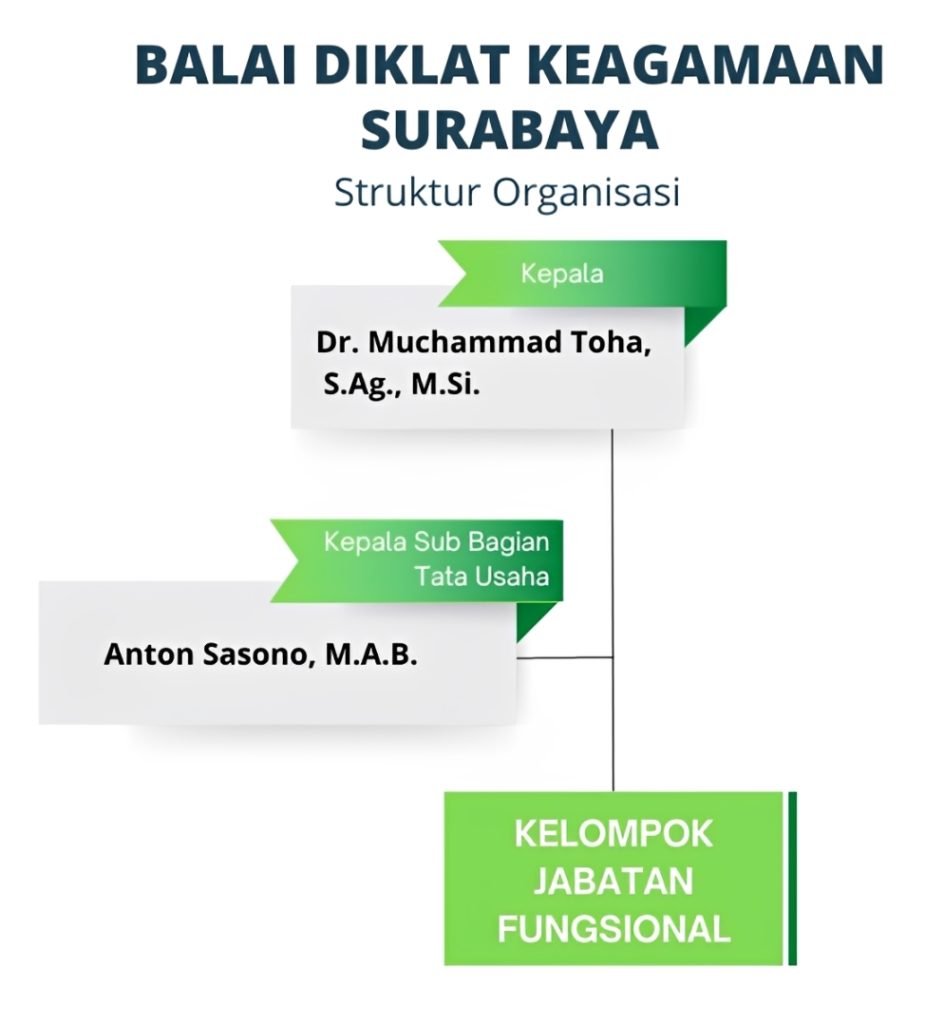 Untuk mengaktualisasikan tugas dan fungsinya, Balai Diklat Keagamaan Surabaya memiliki struktur organisasi yang terdiri dari Kepala Balai yang dibantu oleh Kepala Sub Bagian Tata Usaha. Pegawai yang berstatus ASN pada Balai Diklat Keagamaan Surabaya sejumlah 70 orang dengan perincian: 1 orang Kepala Balai, 1 orang Kepala Sub Bagian Tata Usaha, 14 orang pejabat fungsional umum dan 54 orang pejabat fungsional tertentu.